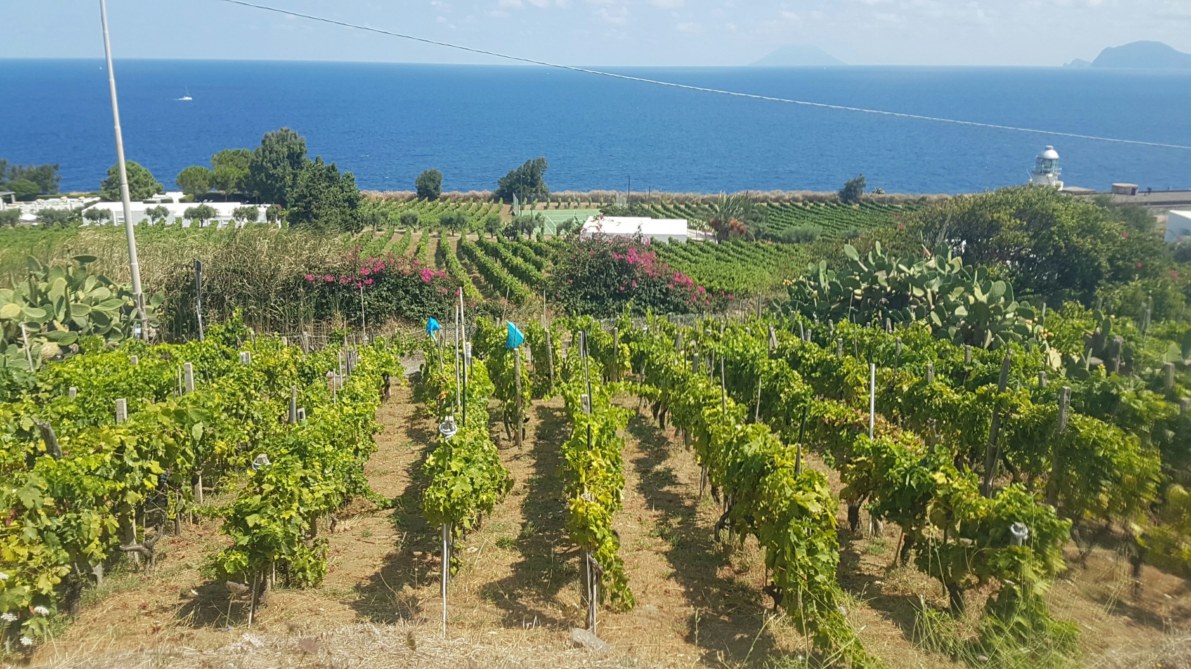 We anchored farther up the island the next night and enjoyed watching the landscape change from dark to white rock. This meant that the beaches onshore also shifted to pure white sand, made from white volcanic silt, which also changed the color of the water underneath to a bright turquoise. We found a nice spot to anchor in the turquoise water and enjoyed watching the sun go down. At 2am, however, we began to regret our choice of spot, when the little house on shore came alive with blaring music, and it became clear we actually anchored outside a club. At 5am, the club lit off fireworks to celebrate the end of the night. We watched in surprise and hoped that no live sparks came down on our boat. It was a sleepless night, but we laughed at the irony that our peaceful spot in the bright blue deep was actually right outside one of the loudest clubs on the island. Salina is an island with multiple peaks from dormant volcanoes. It’s now perhaps the greenest of the islands, covered in thick vegetation. It has also become the key wine making area of the islands, producing a sweet dessert wine called Malvasia. We went for a run from the main town of Santa Marina towards Malfa, and enjoyed running past vineyards and taking in the coastline.